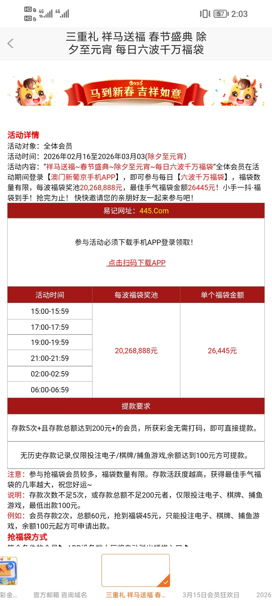 每天都可以抢,我每次都是大几块,一直到元宵节,打出来很多次了 445.com