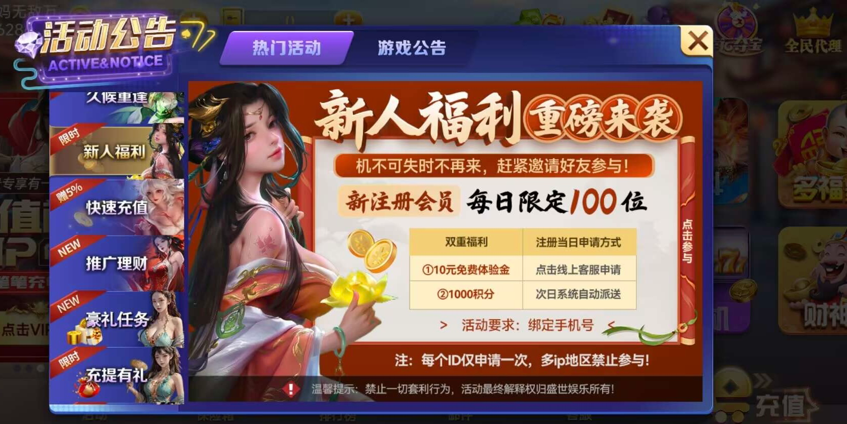 盛世棋牌新人送10